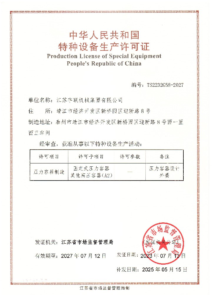 江苏宇联机械集团有限公司是专业从事压力容器产品制造、技术研发转让、化工工艺包总包设计及成套设备缴钥匙工程交付的企业,主要致力于一、二、三(A2)类压力容器非标产品、有色金属(钛材、镍材及镍基合金、结材、银材等)、低温设备、螺旋板换热器设备等;公司创建于2016年,新厂区创建于2022年;公司注册资金8888万元,固定资产12800万元;公司员工人数280人,高级工程师3人,工程师26人,设计人员23人,助理工程师15人,质检员11人,研究生5人,合格持证焊工90人。我公司全体员工以勤奋、执着的精神和坚忍不拔的毅力,奋发进取,不断创新,本着正直、自强和诚实的态度,广泛与社会各界真诚合作、共同发展,为全球市场的化工、医药、机械、电力、轻工、纺织、食品等提供品质卓越的产品。