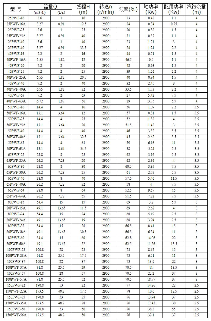 PWF卧式耐腐蚀化工排污泵性能参数表